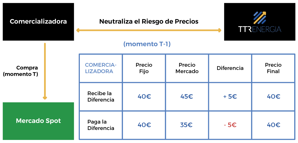 Un contrato SWAP de energía permite al productor fijar el precio de venta para un periodo futuro (semana, mes, trimestre o años sucesivos) de la energía que produce, recibiendo o pagando en la liquidación la diferencia del precio previamente fijado para el mercado spot.