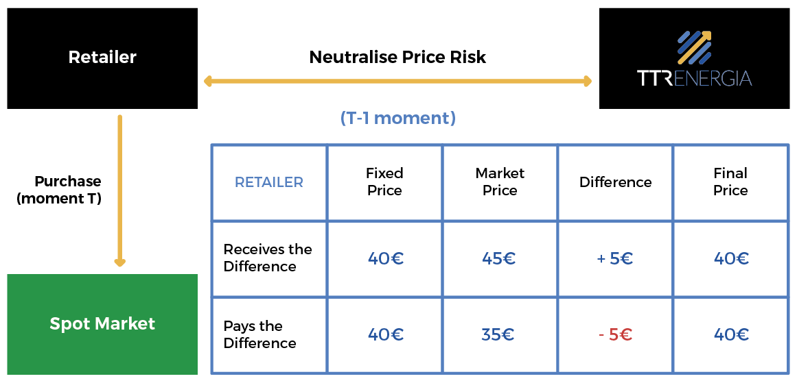 An energy SWAP contract allows the supplier to fix the purchase price of its energy for a future period (week, month, quarter or subsequent years) of the energy it markets, receiving or paying in the settlement the difference with the price fixed for the spot market.